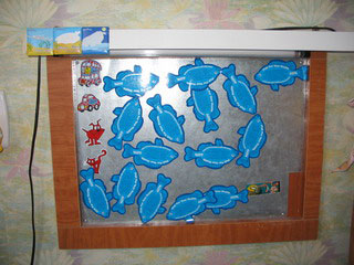 Эти обычные детские часы мы с дочкой самостоятельно декорировали в 4 руки. Просто приклеили на них игрушки от киндер-сюрприза. Подушки я вышила специально для детской, ведь детишки часто сидят на полу и подушек много не бывает. Столик и магнитную доску нам сделал папа из подручных материалов, обрезков ДСП, жести.
